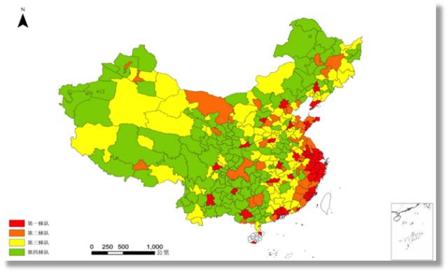 如果看市级数据,收敛的趋势就更加明显。图9a是2011年各市的数字普惠金融发展指数,图9b是2015年的数据。我们将当年的最高发展水平定位基准=100%,然后将所有的市分为四个梯队,>80%为第一梯队,70-80%为第二梯队,60-70%为第三梯队,