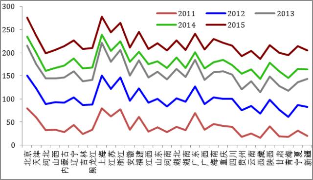图8表明,各省之间数字普惠金融发展水平确实存在比较明显的差别。不过如果把不同的年份的线画在一起,我们可以看到,数字普惠金融的水平已经有很明显的提高,如果我们把2011年的水平定为40,到2015年,这个水平已经上升到了220。也就是说这个数字做普惠金融的潜力非常大,发展水平非常高。但各省之间的差距其实在不断缩小,2011年的变异系数是0.47,2015年只有0.1。
