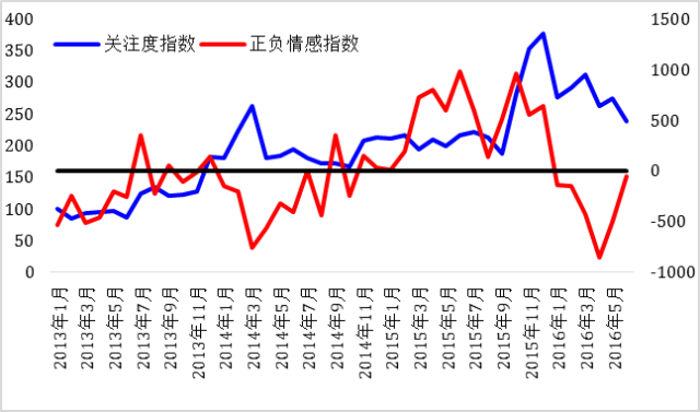 红色这条线是情感指数,可以看到过去这段时间,虽然关注度在上升,但情感一直非常复杂, 在正负之间大幅波动。2015年第四季度开始从高值快速回落,2016年第二季度初达到了最低点。不过最近又有所恢复,几乎回到了历史平均水平。