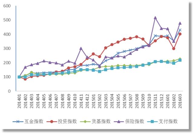 指数从2014年1月份开始,涵盖支付、货币基金、投资、保险和征信等几个业务类别,具体分解到省、市一级。图4表明,从2014年1月到现在,中国互联网金融发展的水平,大概就是每年翻一番。不同的业务的发展速度不太一样,但发展速度相对较慢的支付和货币基金业务,恰恰也是发展水平比较高的业务。